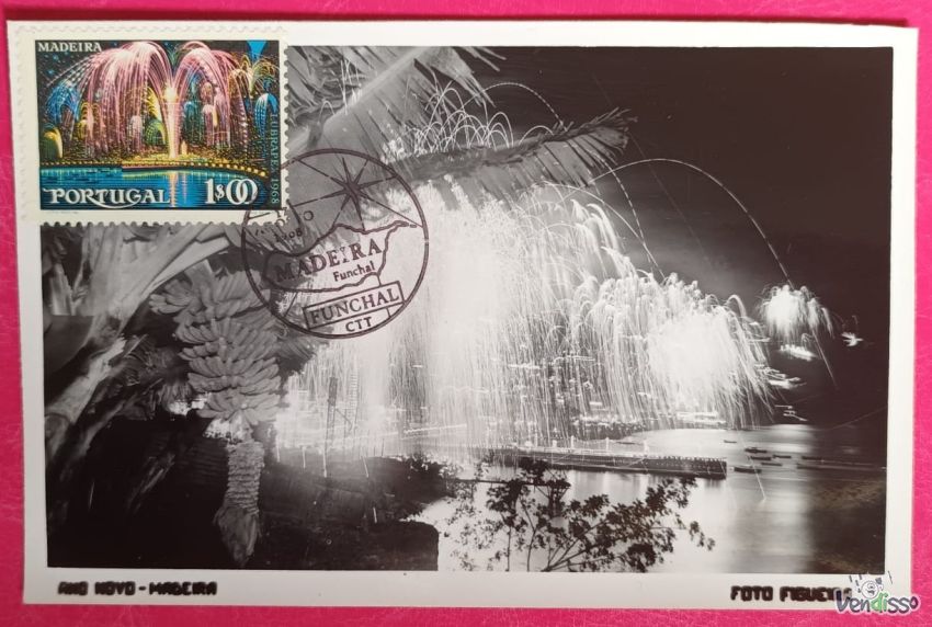 Postal antiga de Madeira, Funchal, com vista noturna de fogos de artifício.