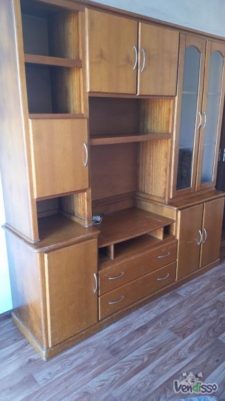 Móvel de sala de estar com vitrine em madeira maciça. Apresenta algumas marcas na madeira devido ao usop